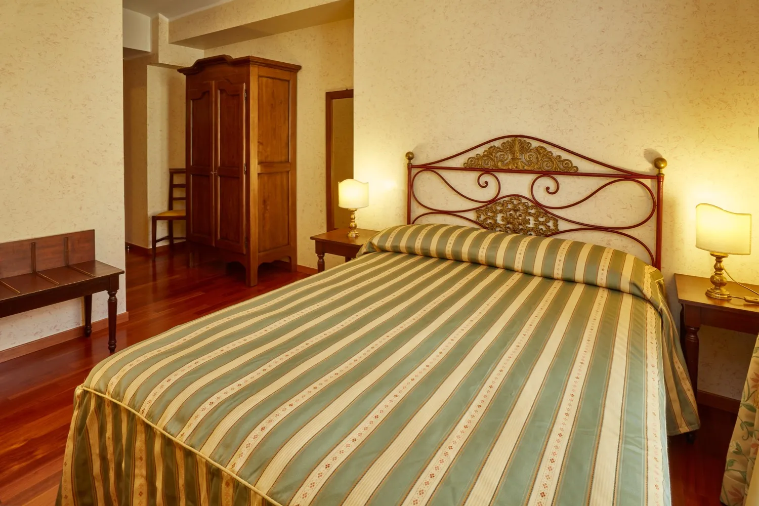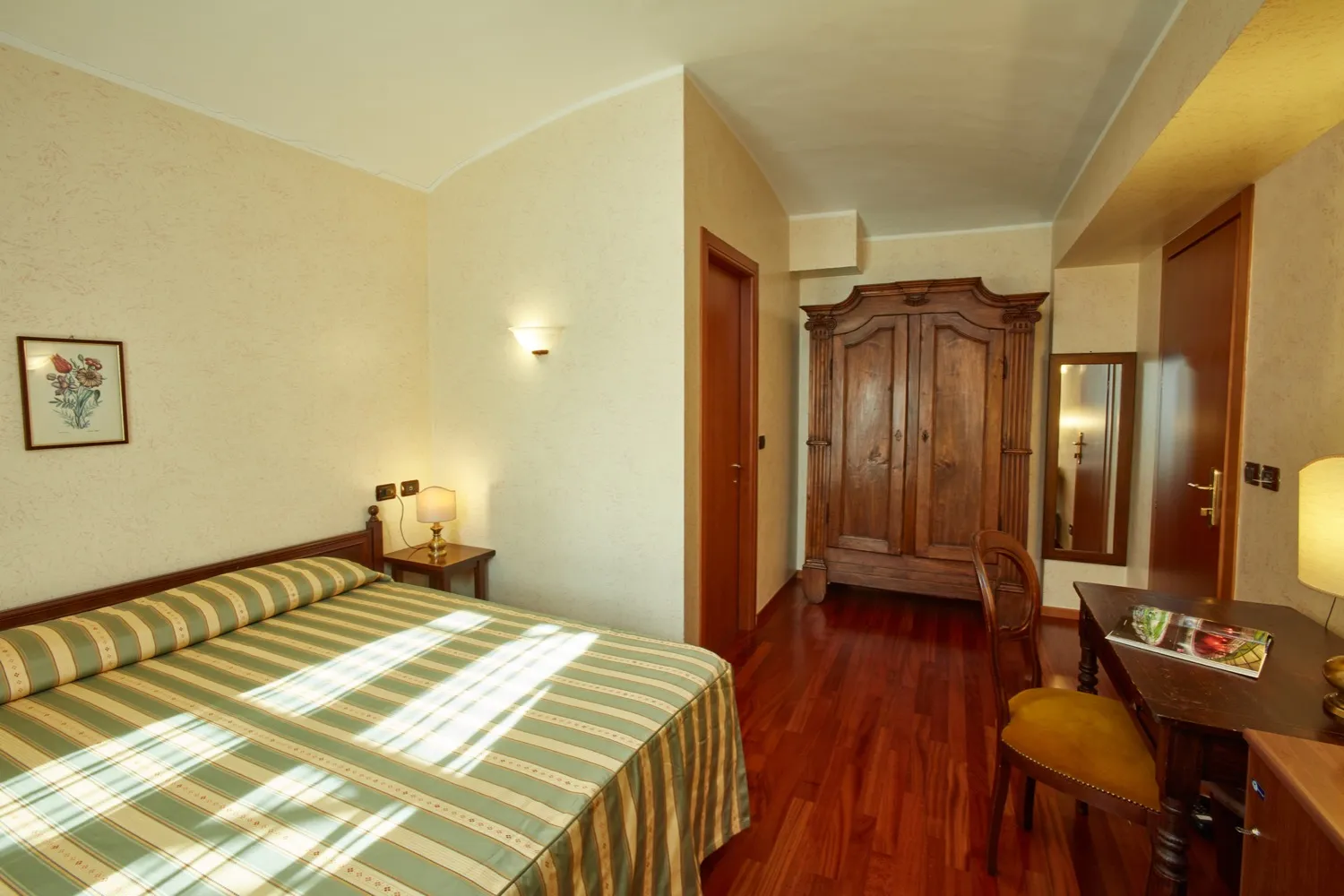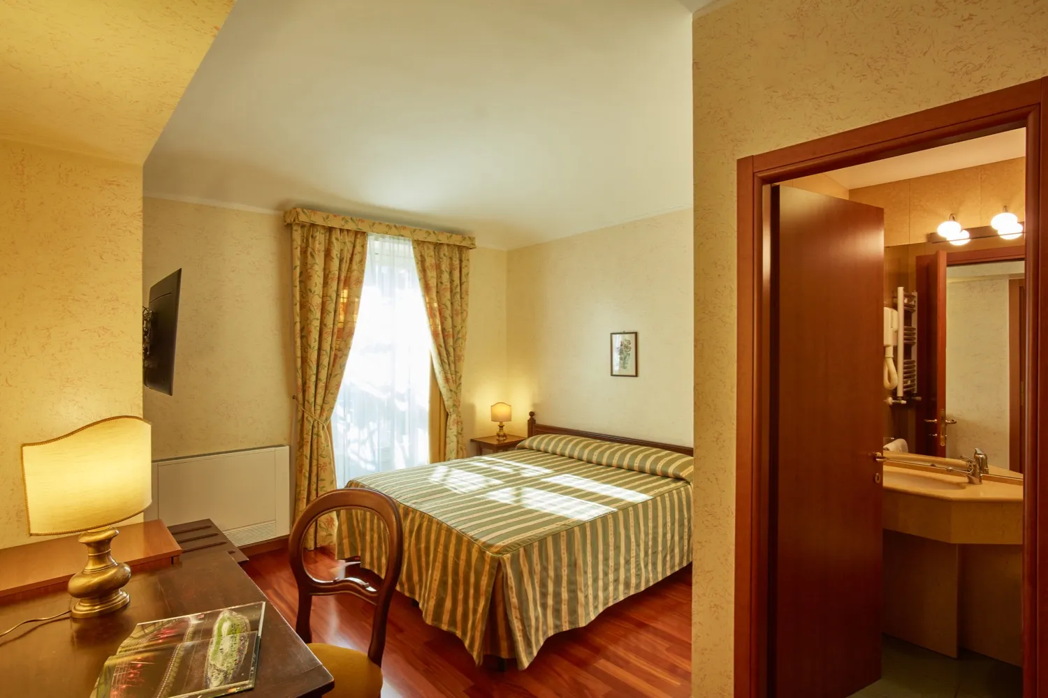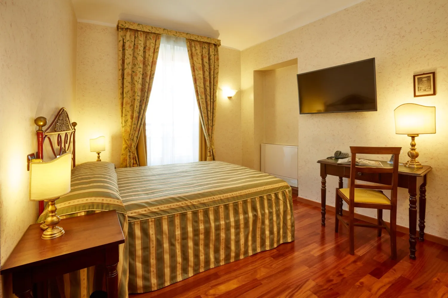 Camera hotel singola, accogliente e sobria adatta ad ospitare comodamente 1 persona, di mq. 15, con ampio letto singolo in soluzione b&b. La camera è provvista di pavimento parquet, di aria condizionata e riscaldamento autonomo, SMART TV da 43″, canali satellitari, cassaforte elettronica, business desk, telefono con linea diretta, 2 linee wi-fi, bagno con doccia, minibar. Arredamento in stile e porta da 90 cm per un accesso facilitato.