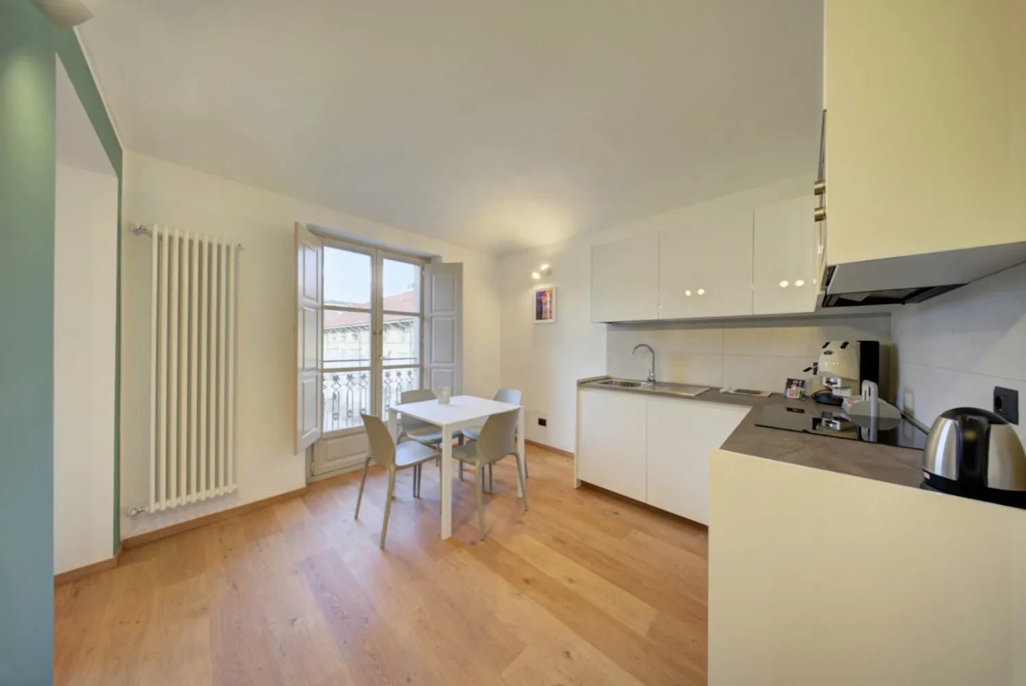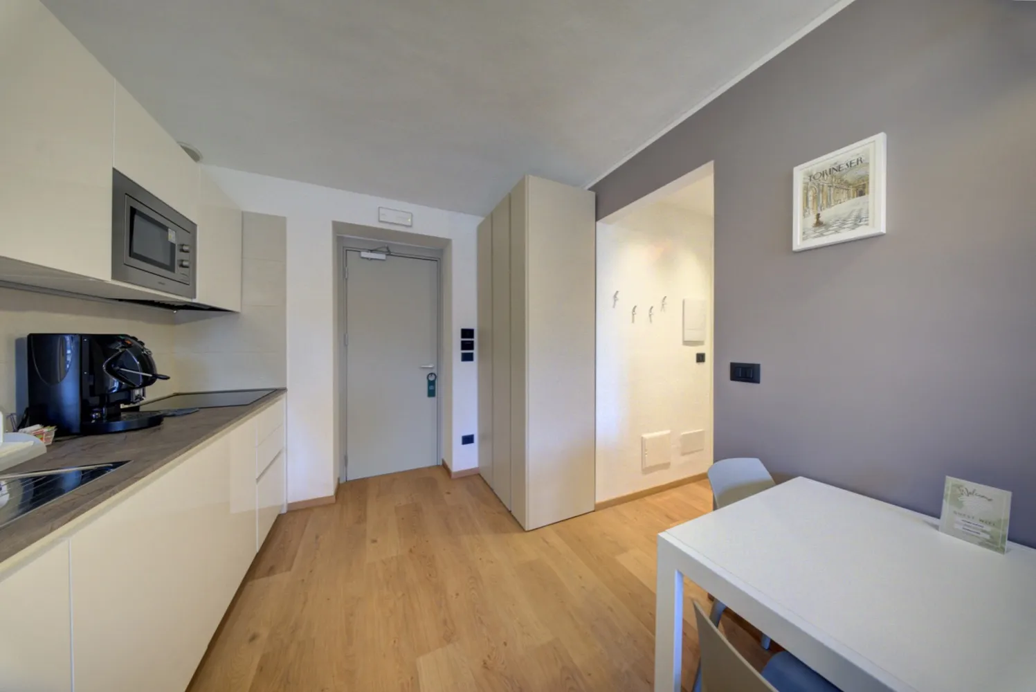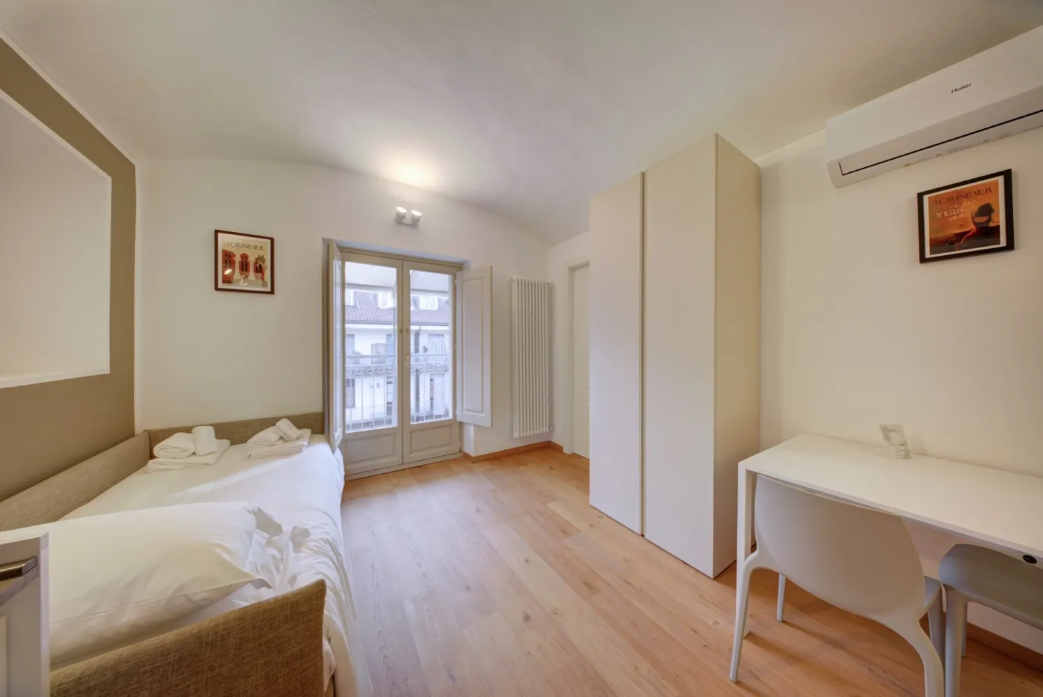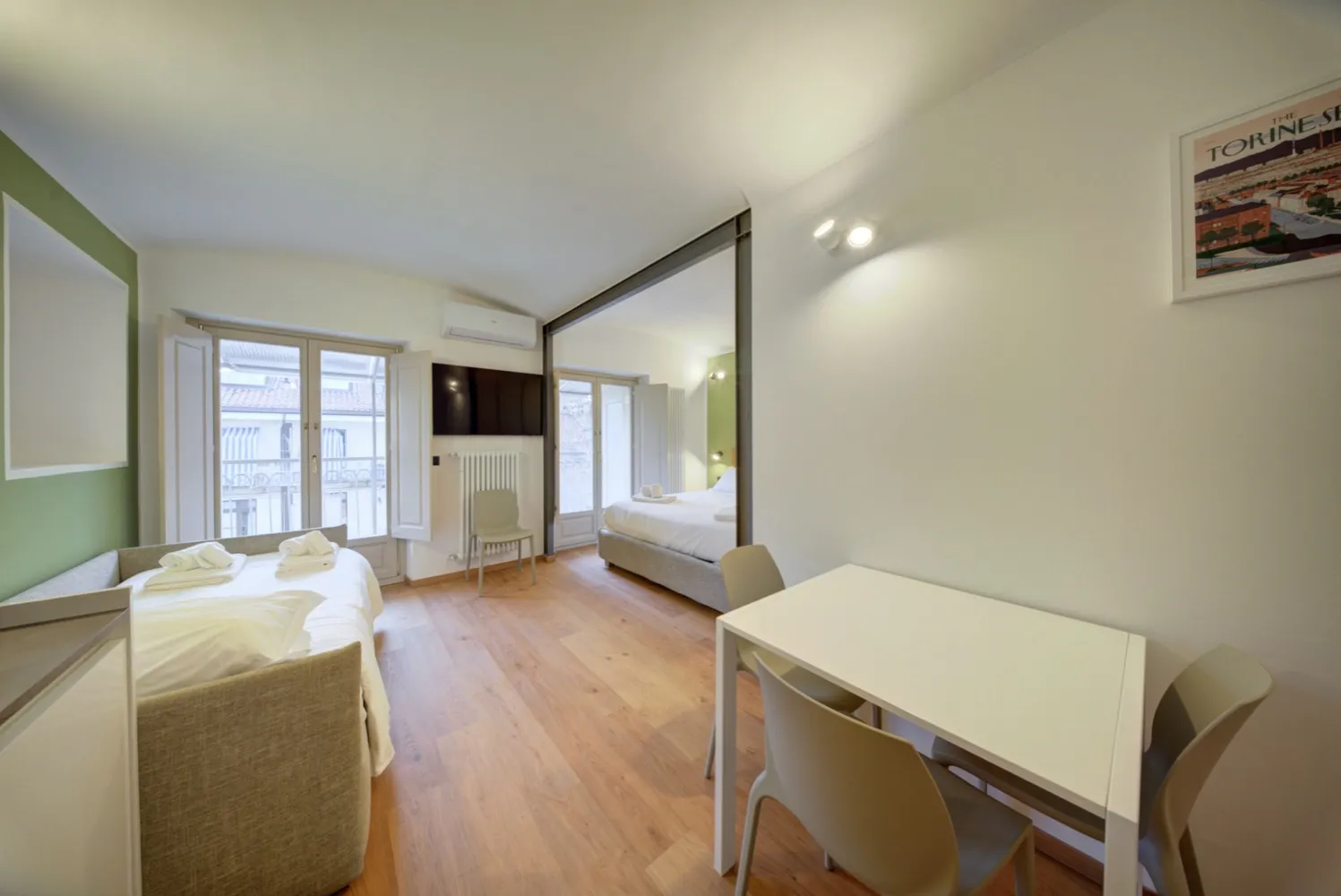 Mini appartamento in Hotel 3 stelle a Torino in centro, accogliente adatto ad ospitare comodamente fino a 6 persone, di mq. 38, con letti singoli e matrimoniale. La camera è provvista di pavimento parquet, di aria condizionata e riscaldamento autonomo, SMART TV da 43″, canali satellitari, cassaforte elettronica, business desk, telefono con linea diretta, 2 linee wi-fi, bagno con doccia, minibar. Arredamento in stile e porta da 90 cm per un accesso facilitato. Soluzione B&B.